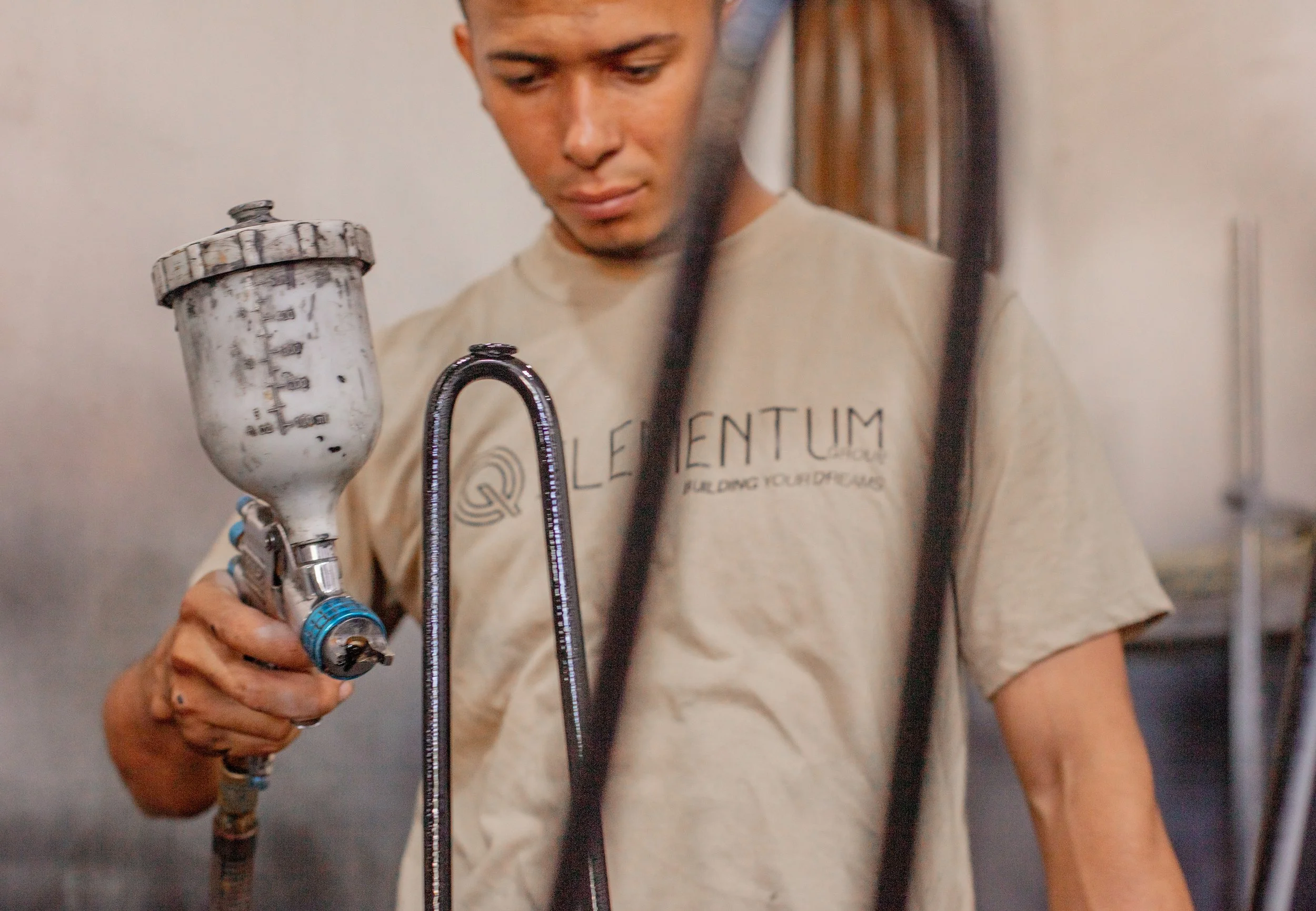 En Qelementum fabricamos muebles para interiores y exteriores elaborados con madera, acero y fibras naturales. Nuestro taller de carpintería y herrería cuenta también con horno para pintura y trabajamos con tapizados de alta calidad. Aportamos nuestro grano de arena a la práctica sostenible contando con el trabajo de artesanos locales muy calificados.